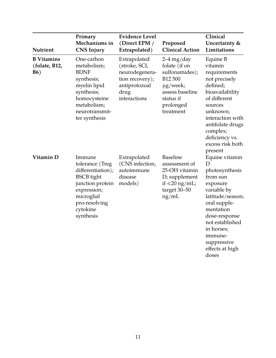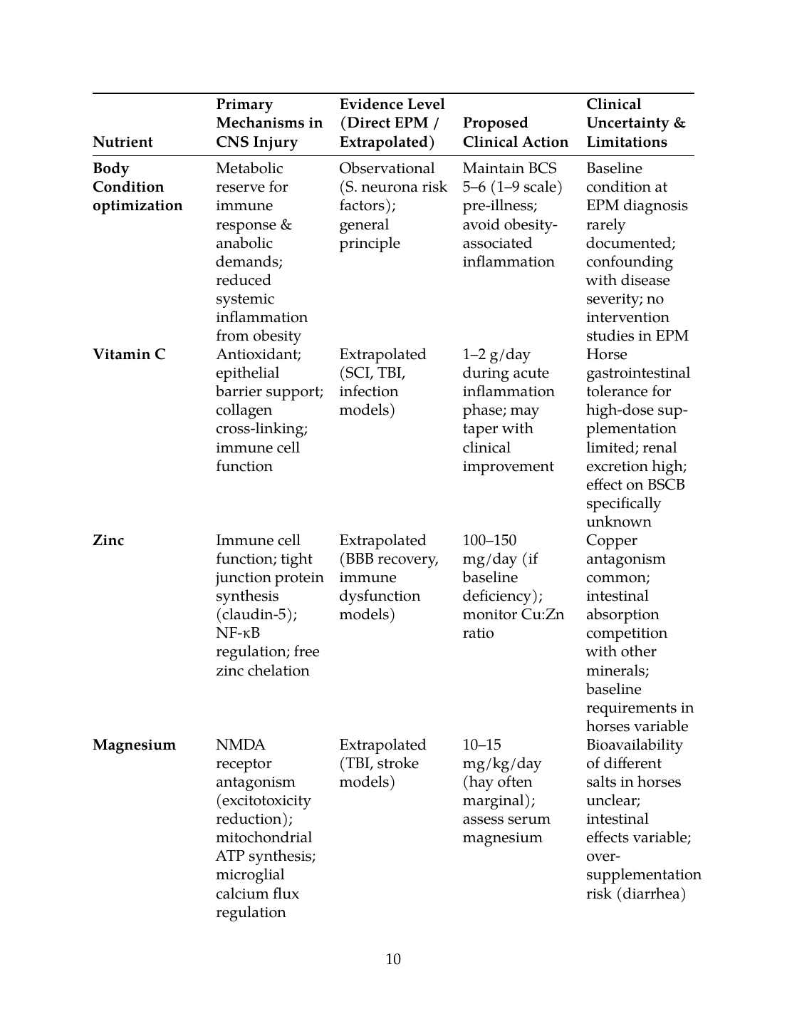 - Equine-specific kinetic and efficacy data are absent for most micronutrient supplementation in neurologic disease; doses and durations are extrapolated from human studies or rodent models with uncertain validity in horses.