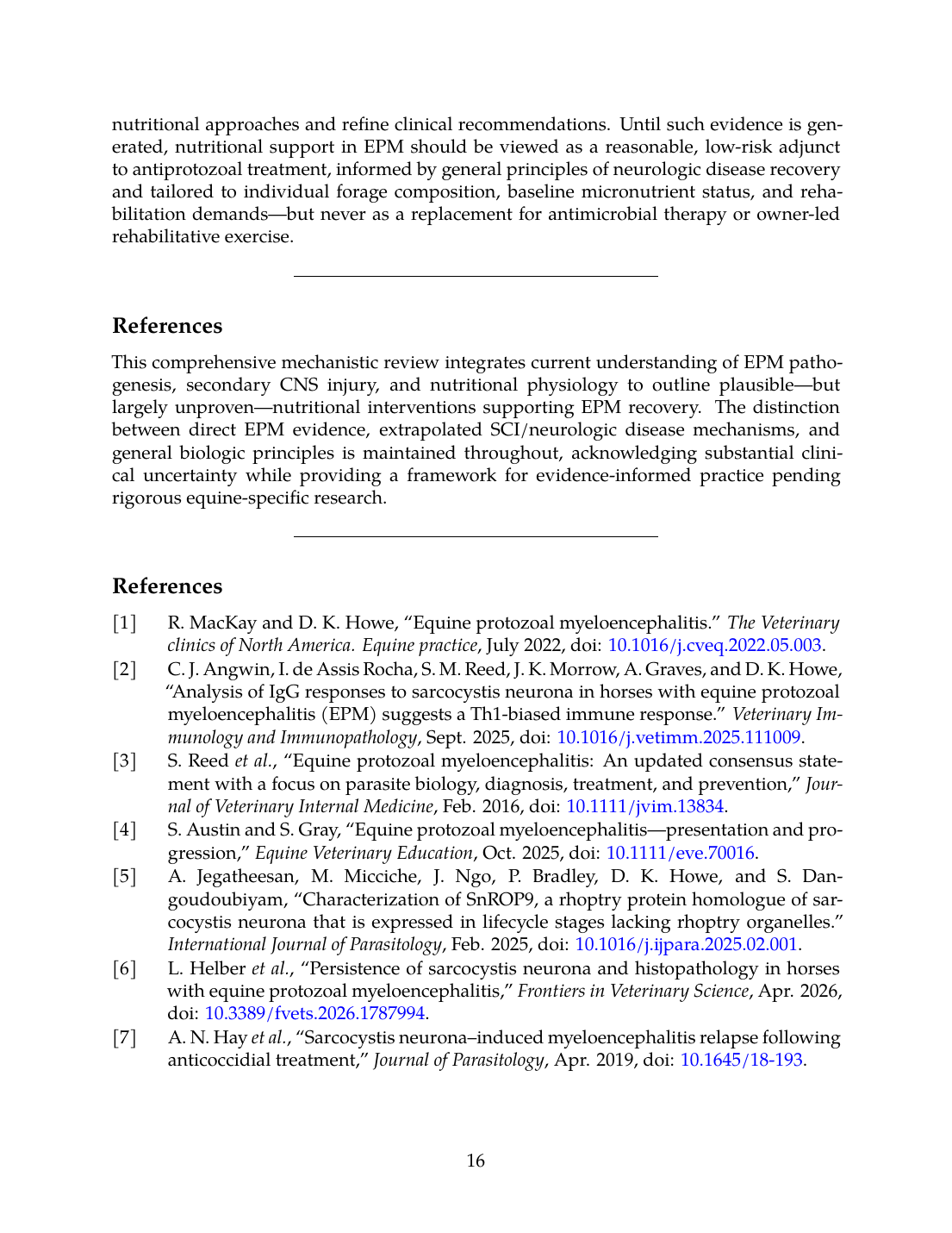 - S. Reed, S. Reed, M. Furr, D. Howe, A. L. Johnson, R. MacKay, J. Morrow, N. Pusterla, and S. Witonsky, “Equine Protozoal Myeloencephalitis: An Updated Consensus Statement with a Focus on Parasite Biology, Diagnosis, Treatment, and Prevention,” Journal of Veterinary Internal Medicine, Feb. 2016. doi: 10.1111/jvim.13834. View source