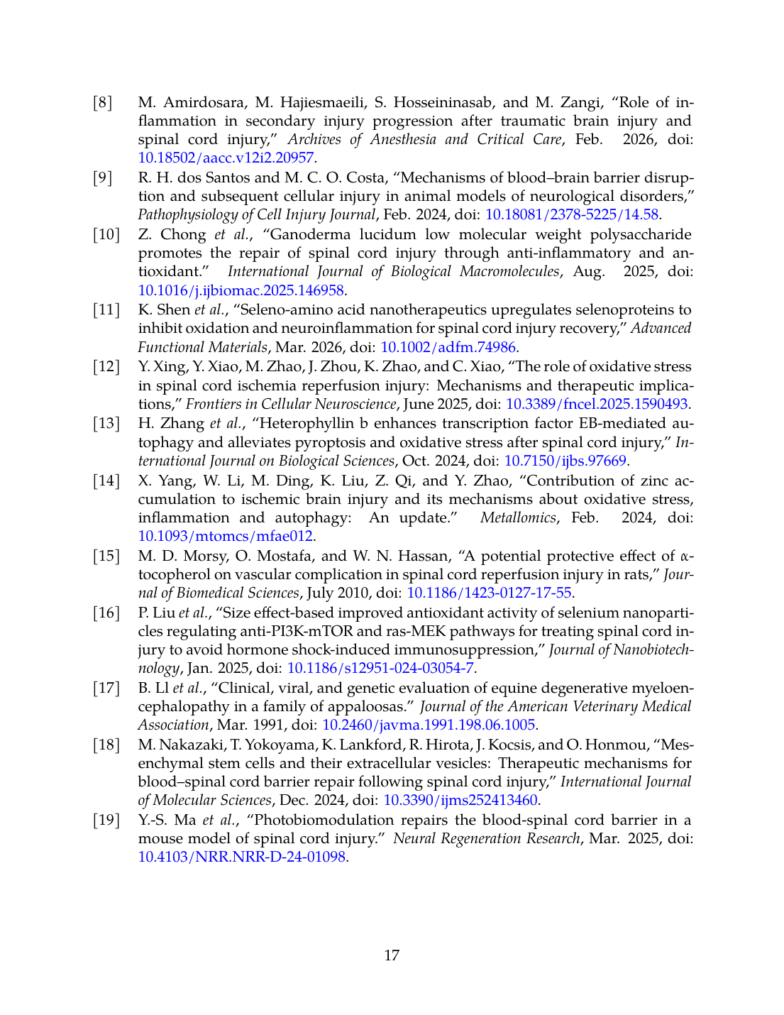 - Y. Xing, Y. Xiao, M. Zhao, J. Zhou, K. Zhao, and C. Xiao, “The role of oxidative stress in spinal cord ischemia reperfusion injury: mechanisms and therapeutic implications,” Frontiers in Cellular Neuroscience, Jun. 2025. doi: 10.3389/fncel.2025.1590493. View source