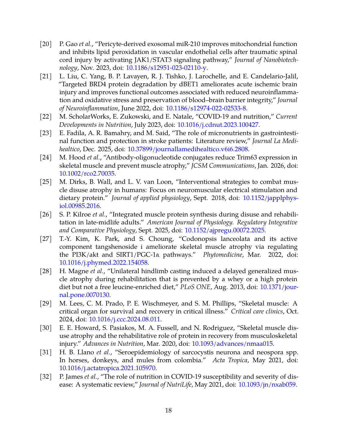 - E. E. Howard, S. Pasiakos, M. A. Fussell, and N. Rodriguez, “Skeletal Muscle Disuse Atrophy and the Rehabilitative Role of Protein in Recovery from Musculoskeletal Injury.,” Advances in Nutrition, Mar. 2020. doi: 10.1093/advances/nmaa015. View source