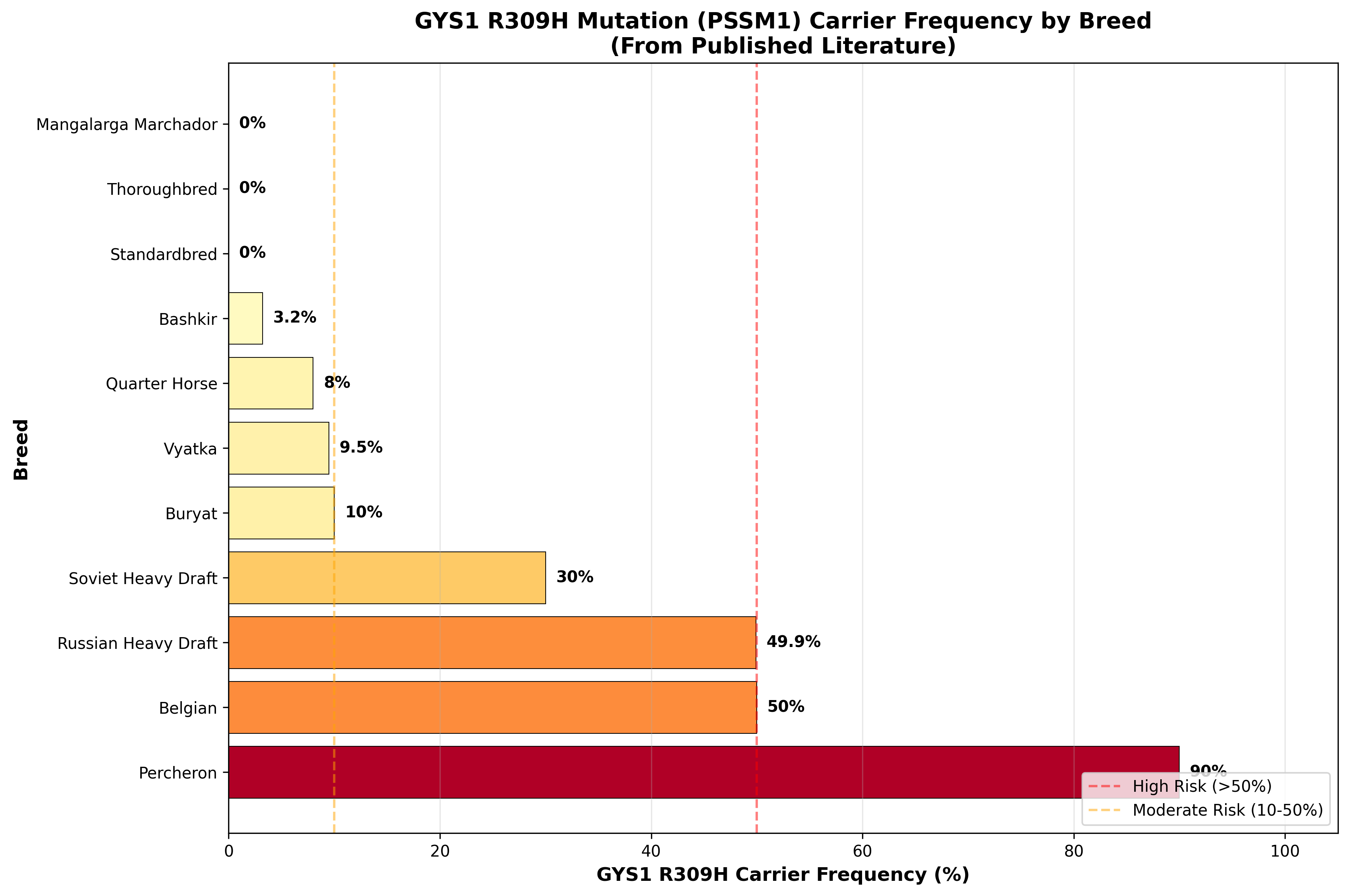 Figure 1: GYS1 R309H mutation carrier frequency by breed as documented in published literature. Draft breeds, particularly Percheron and Belgian, show the highest carrier frequencies, warranting mandatory genetic testing before breeding [8],[3].