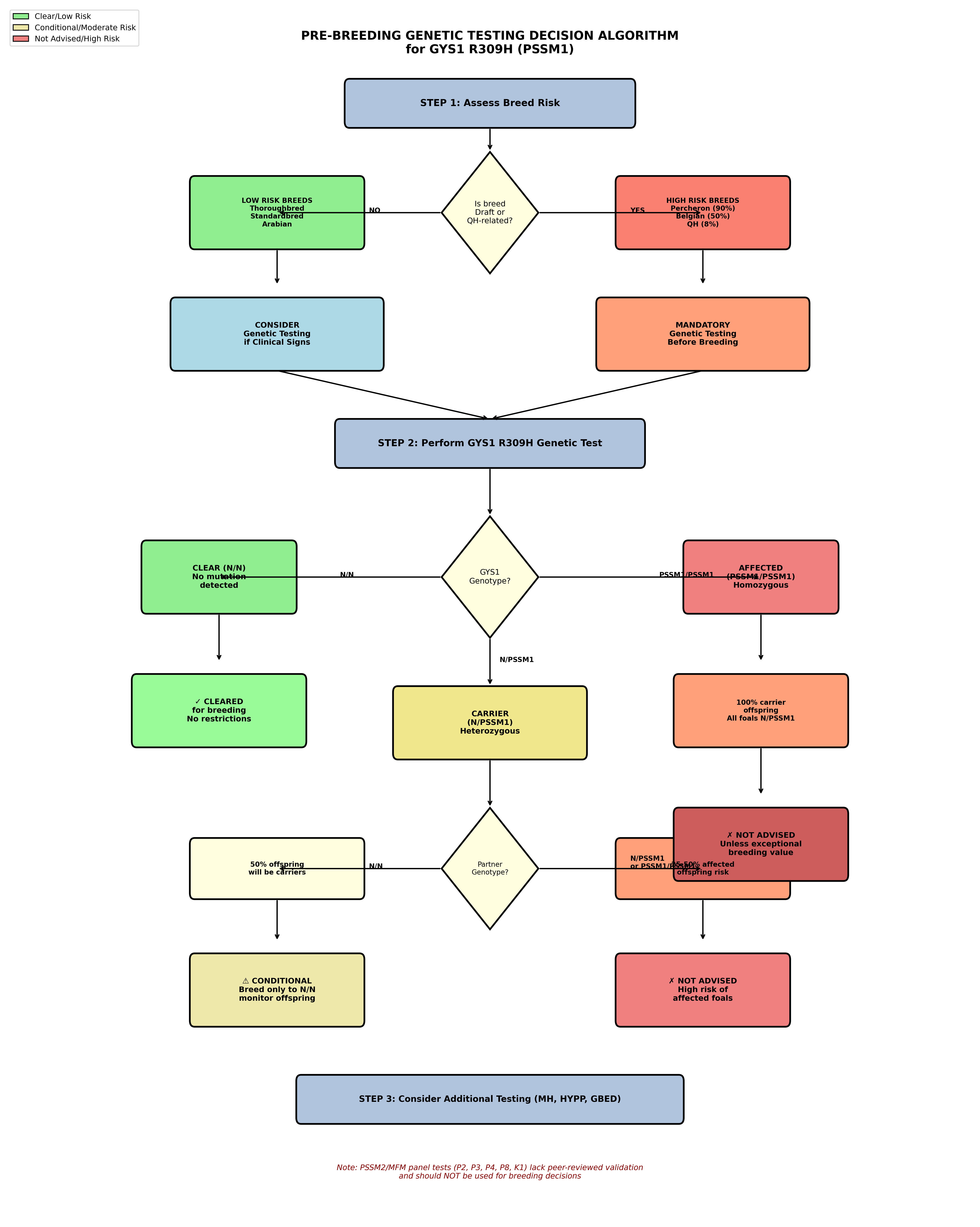 Figure 2: Pre-breeding genetic testing decision algorithm for GYS1 R309H (PSSM1). This flowchart guides breeding decisions based on breed risk assessment and genetic test results. High-risk draft breeds require mandatory testing, while carrier horses should only be bred to clear partners [11],[15],[8].