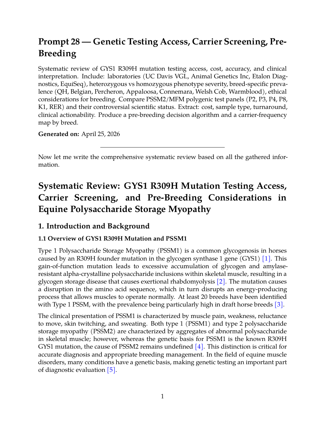 This systematic review confirms that GYS1 R309H mutation testing for PSSM1 is scientifically validated, clinically actionable, and essential for breeding management in high-risk breeds. Multiple accredited laboratories offer reliable testing at accessible price points ($40-45 for single tests) with reasonable turnaround times (3-10 business days). The mutation shows incomplete dominance with homozygotes exhibiting more severe pathology than heterozygotes. Carrier frequencies vary dramatically by breed, from 90% in Percheron horses to 0% in Thoroughbreds and Standardbreds.