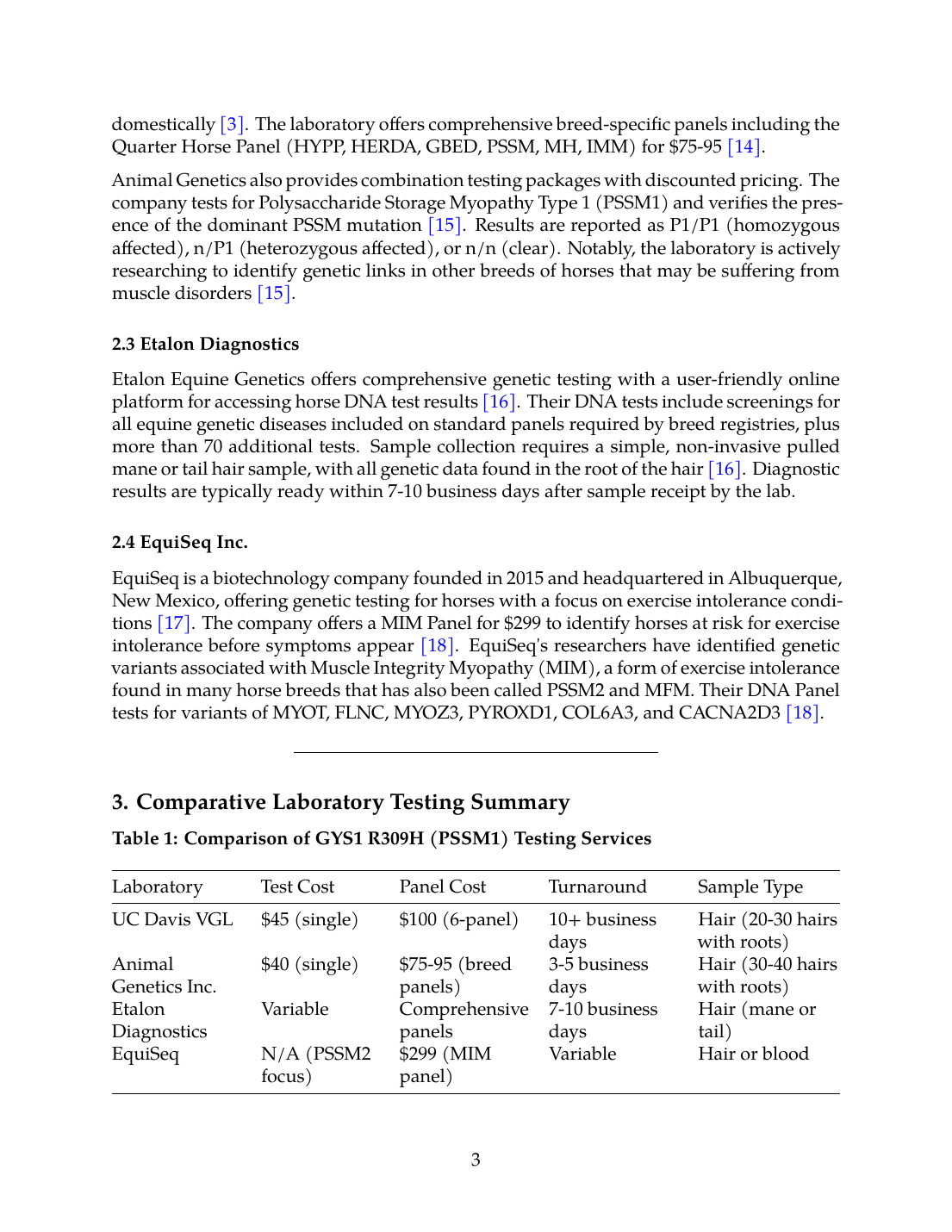 Animal Genetics Inc. is described as the largest private provider of genetic testing services for horses, dogs, and pigeons, offering a variety of reliable, state-of-the-art DNA tests [13]. The PSSM1 test is available for $40 per sample, with a turnaround time of 3-5 business days domestically [3]. The laboratory offers comprehensive breed-specific panels including the Quarter Horse Panel (HYPP, HERDA, GBED, PSSM, MH, IMM) for $75-95 [14].