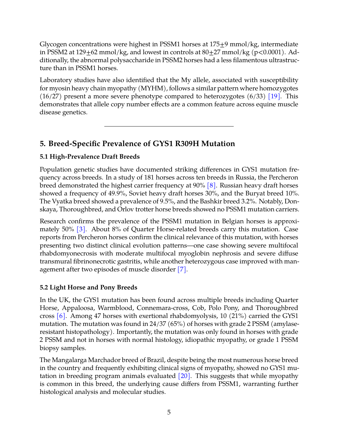 The Mangalarga Marchador breed of Brazil, despite being the most numerous horse breed in the country and frequently exhibiting clinical signs of myopathy, showed no GYS1 mutation in breeding program animals evaluated [20]. This suggests that while myopathy is common in this breed, the underlying cause differs from PSSM1, warranting further histological analysis and molecular studies.
