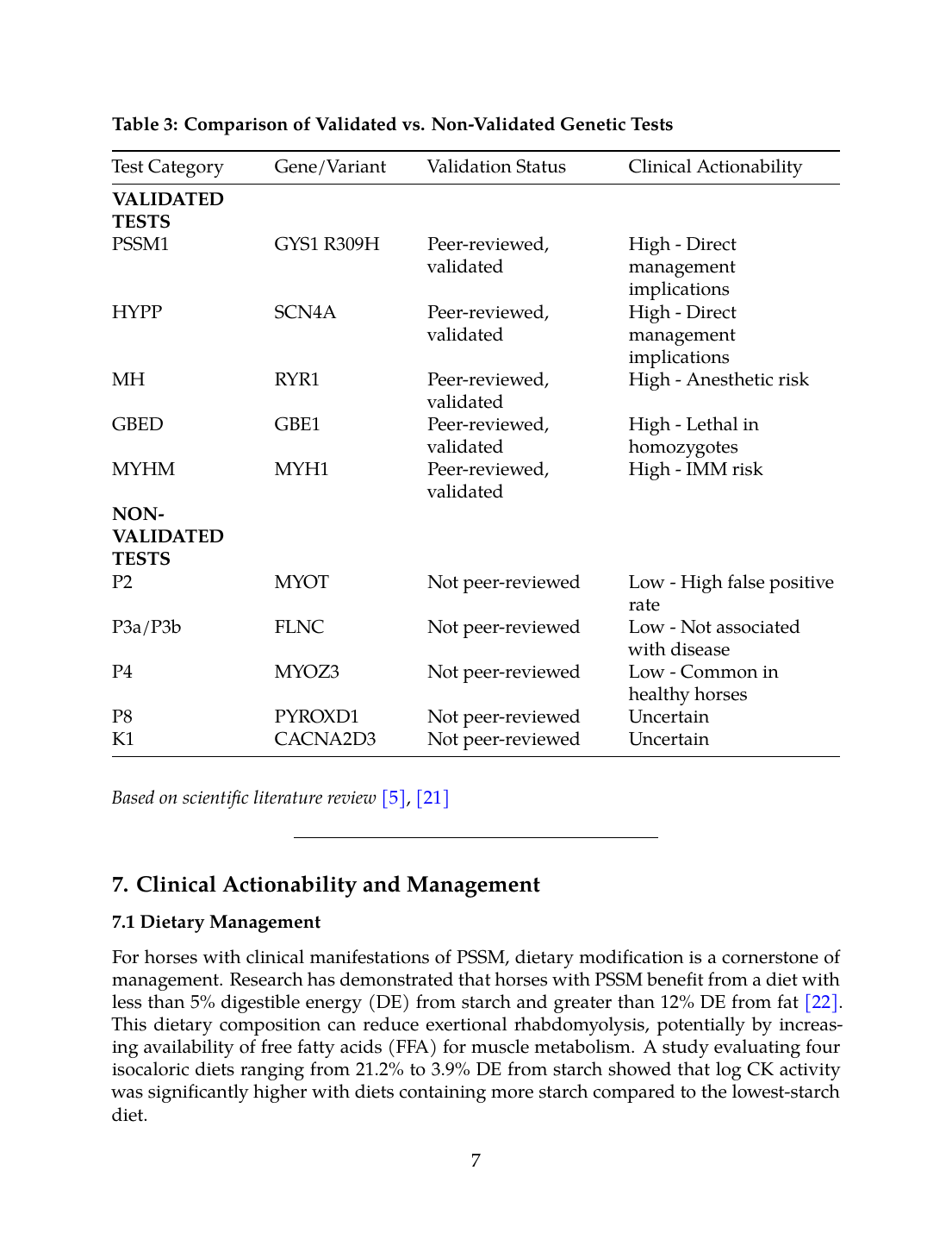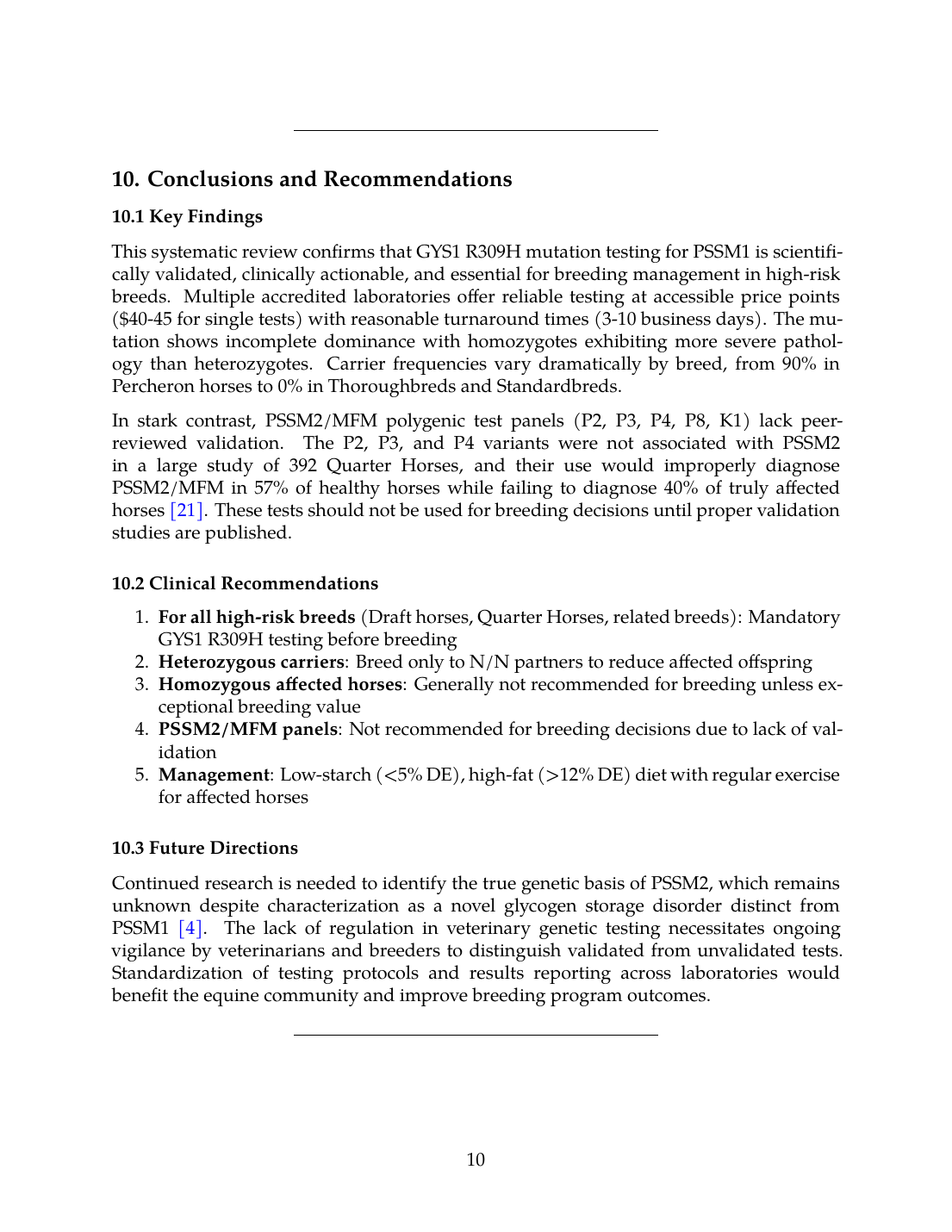 In stark contrast, PSSM2/MFM polygenic test panels (P2, P3, P4, P8, K1) lack peer-reviewed validation. The P2, P3, and P4 variants were not associated with PSSM2 in a large study of 392 Quarter Horses, and their use would improperly diagnose PSSM2/MFM in 57% of healthy horses while failing to diagnose 40% of truly affected horses [21]. These tests should not be used for breeding decisions until proper validation studies are published.
