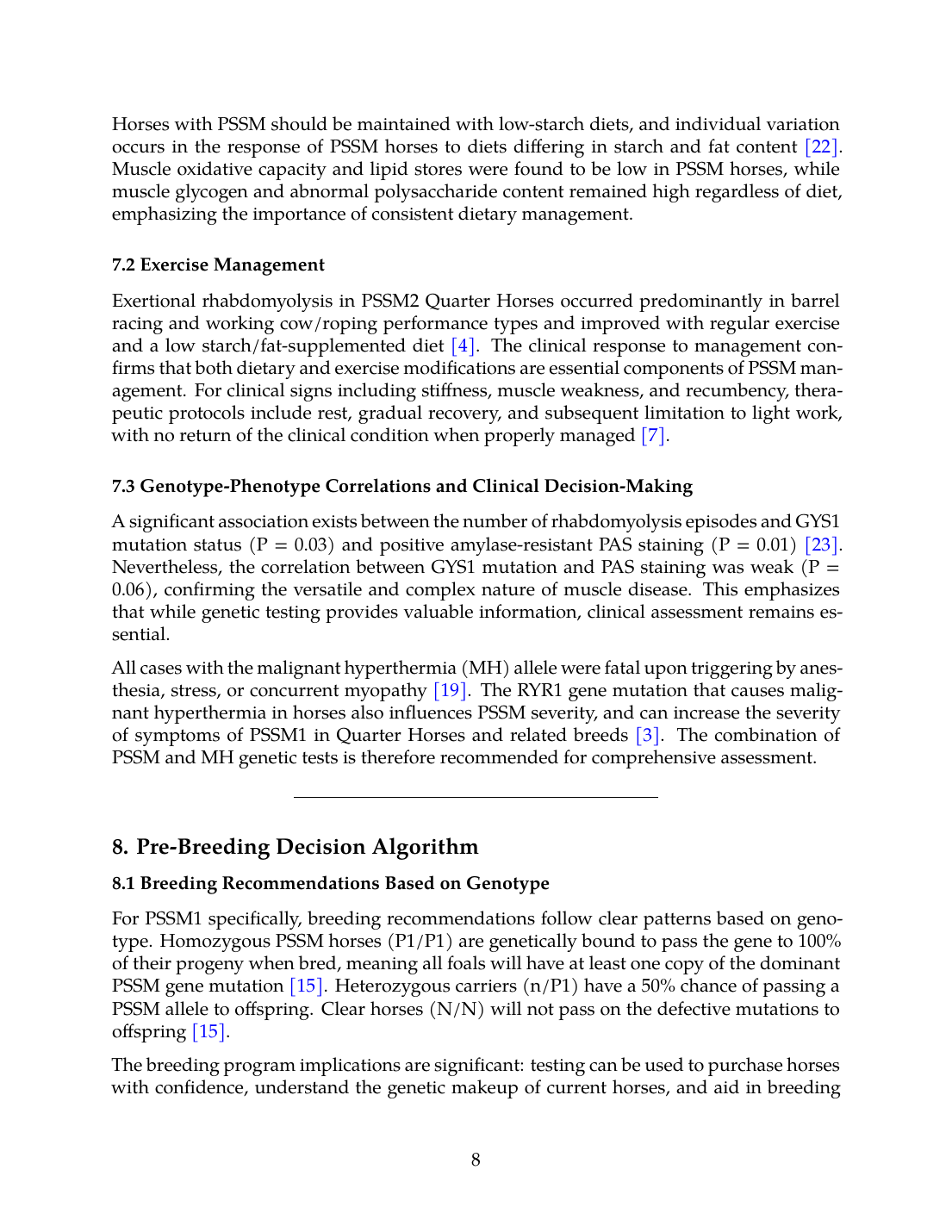 Exertional rhabdomyolysis in PSSM2 Quarter Horses occurred predominantly in barrel racing and working cow/roping performance types and improved with regular exercise and a low starch/fat-supplemented diet [4]. The clinical response to management confirms that both dietary and exercise modifications are essential components of PSSM management. For clinical signs including stiffness, muscle weakness, and recumbency, therapeutic protocols include rest, gradual recovery, and subsequent limitation to light work, with no return of the clinical condition when properly managed [7].