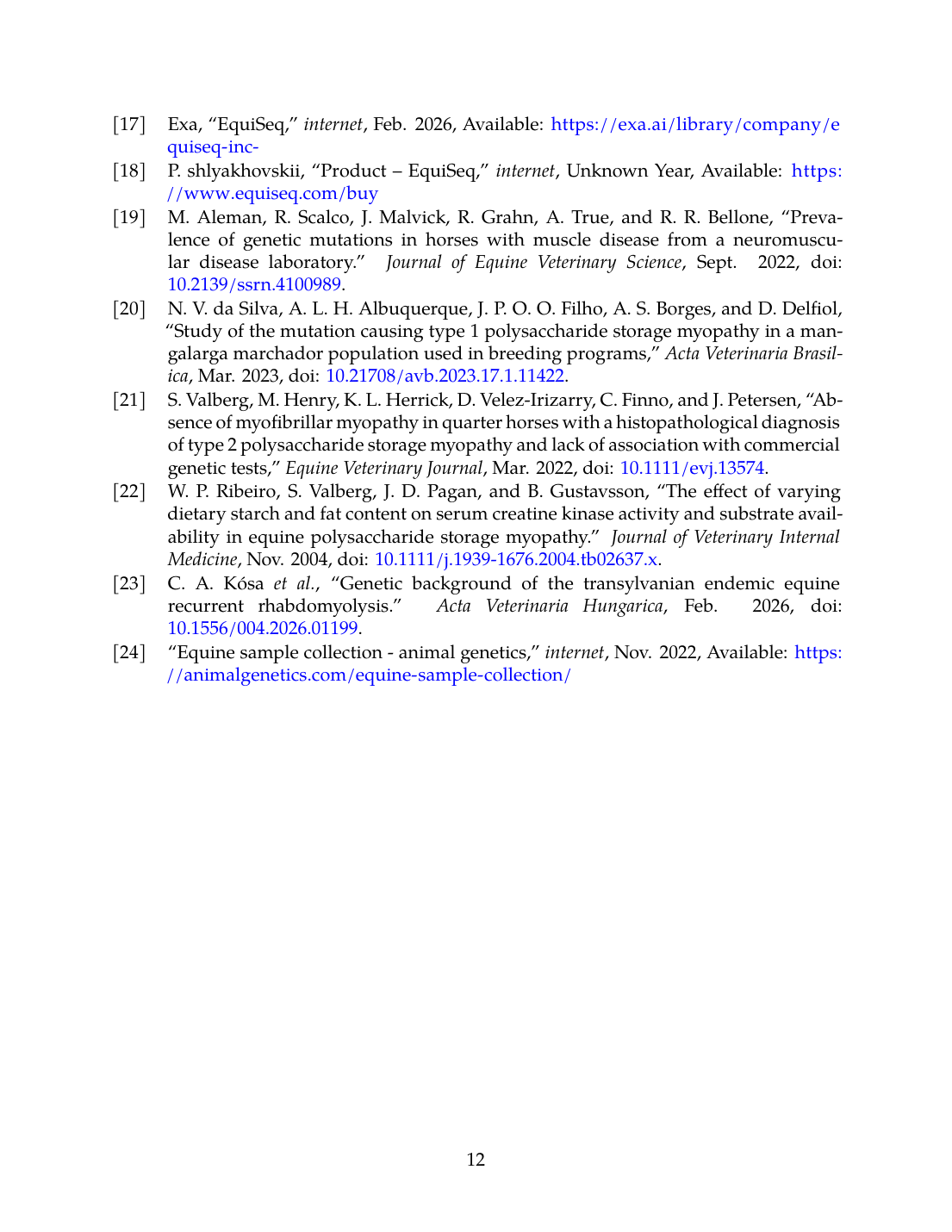 23. C. A. Kósa, O. Szenci, L. Lénárt, I. Biksi, R. Szép, Á. Keresztesi, M. Mircean, M. Tăulescu, and O. Kutasi, “Genetic background of the Transylvanian endemic equine recurrent rhabdomyolysis.,” Acta Veterinaria Hungarica, Feb. 2026. doi: 10.1556/004.2026.01199. View source
