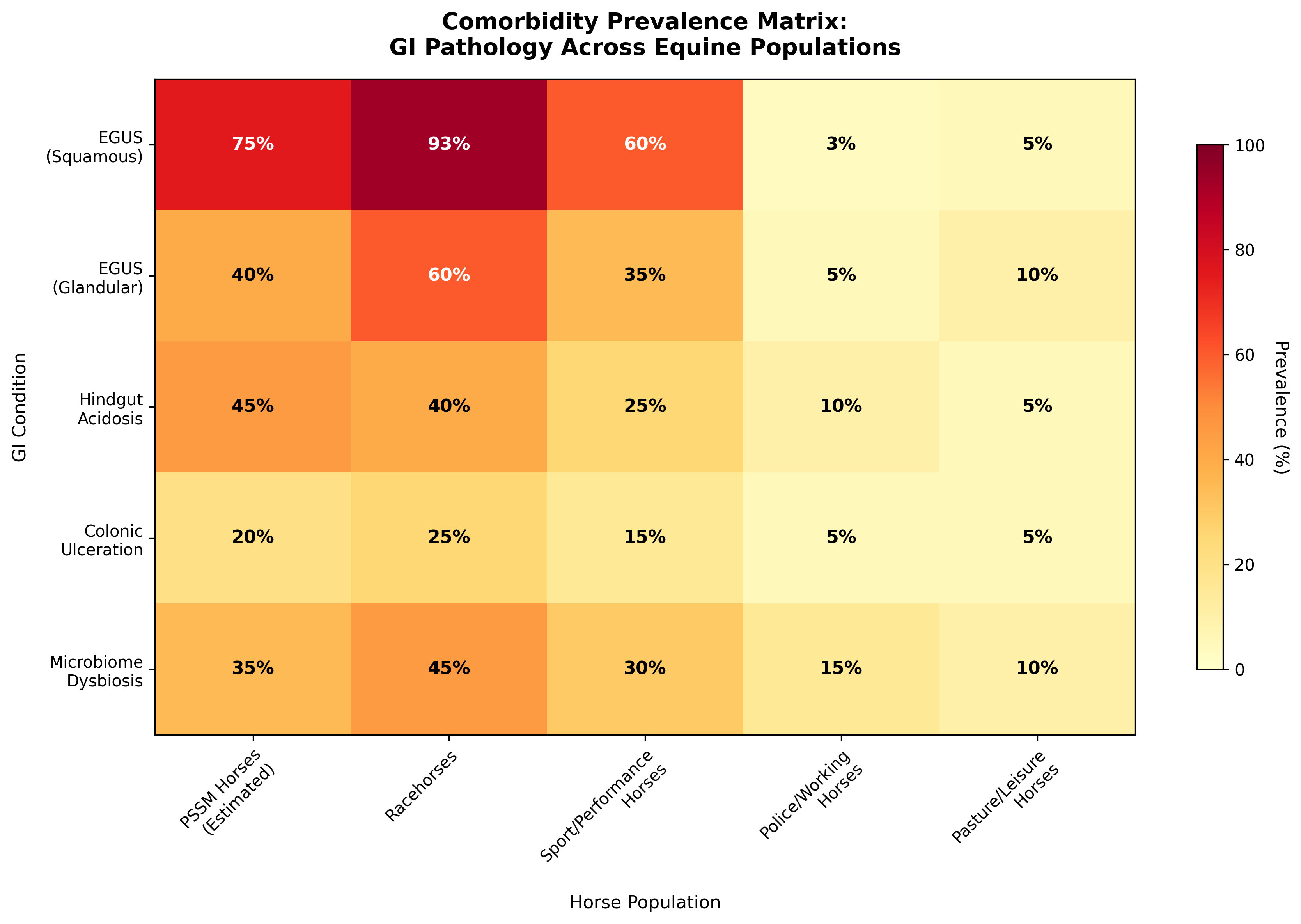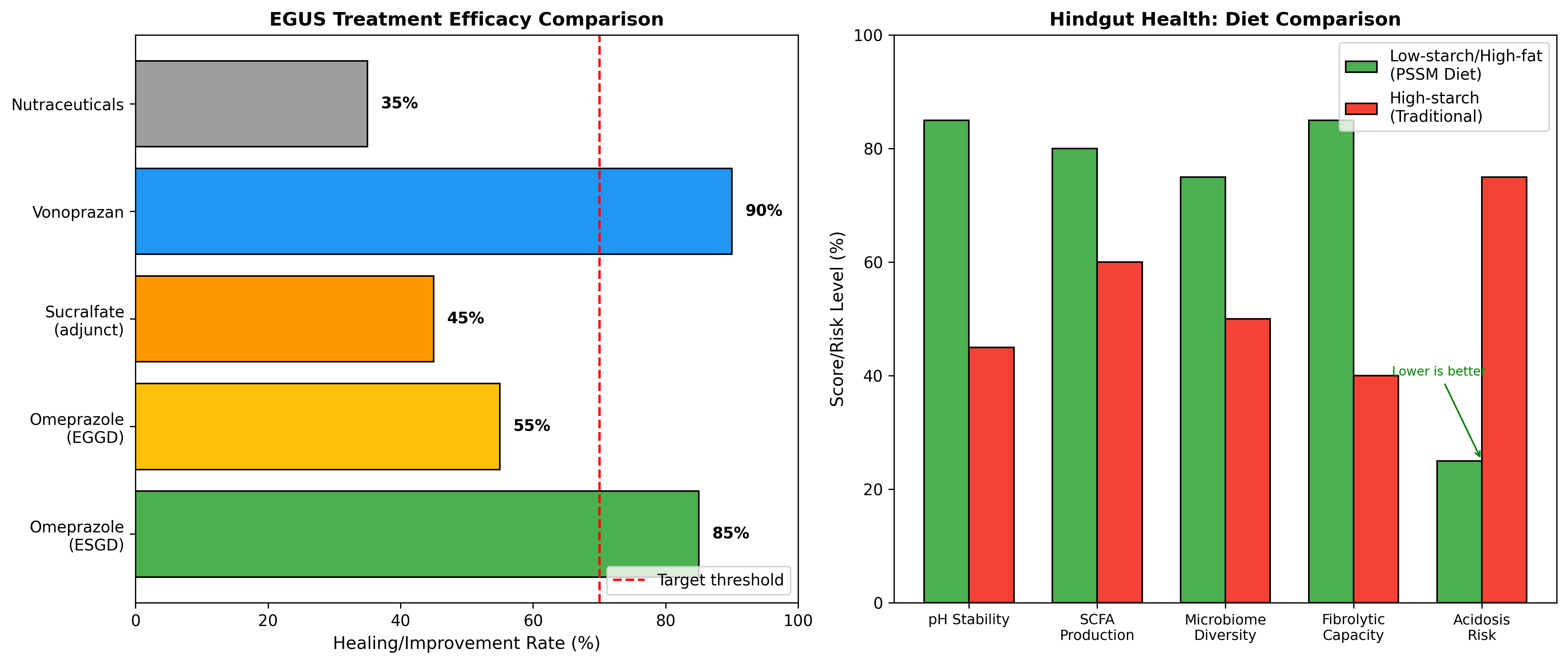 | Population | EGUS (Squamous) | EGUS (Glandular) | Hindgut Acidosis Risk | Colonic Ulceration | Microbiome Dysbiosis |