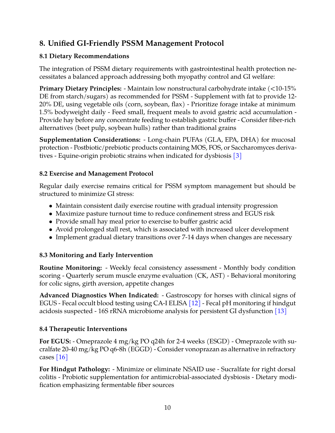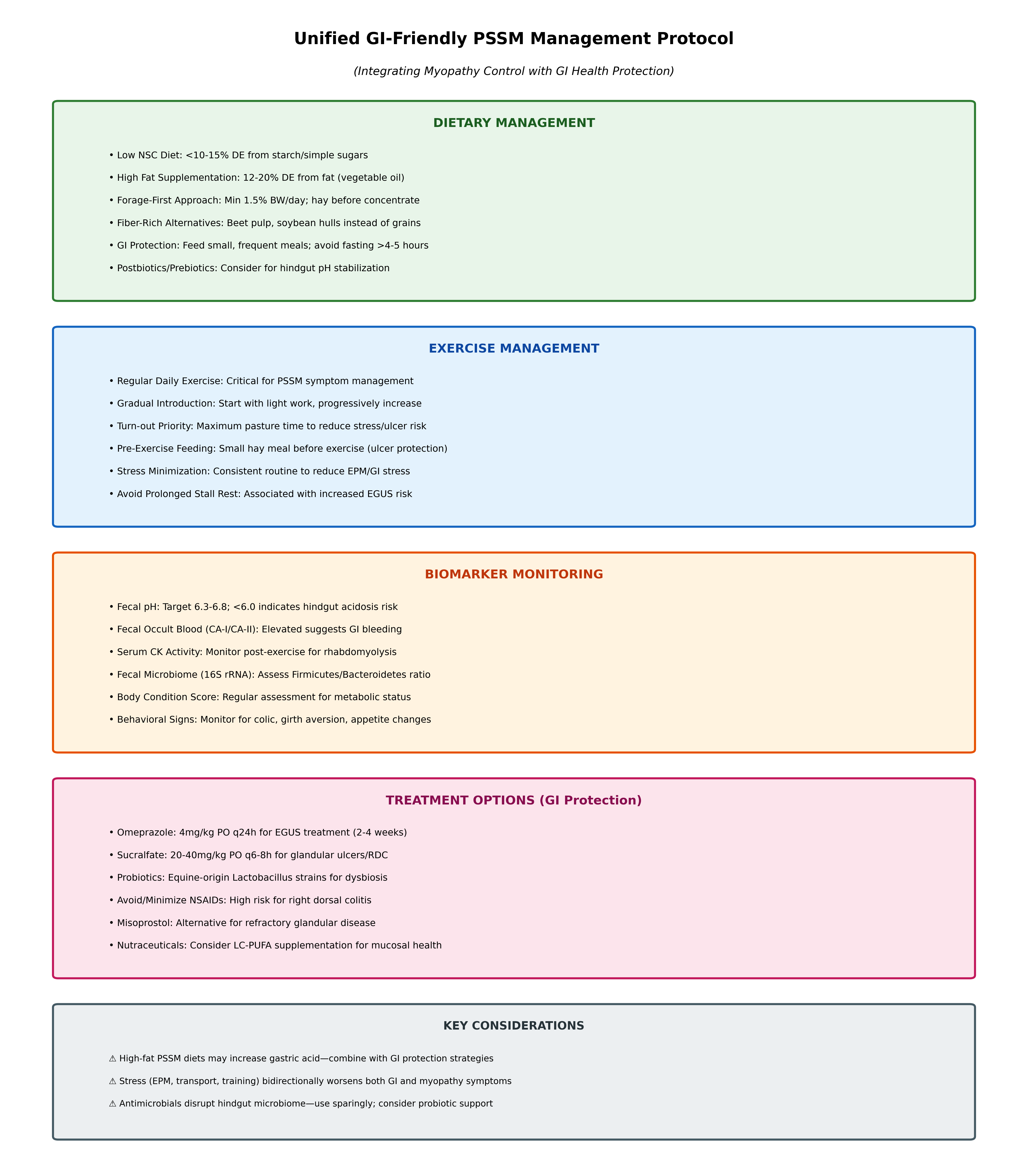 The unified GI-friendly PSSM management protocol presented herein provides an evidence-based framework for integrating myopathy control with gastrointestinal health protection, though individualization based on clinical presentation and response to therapy remains essential.