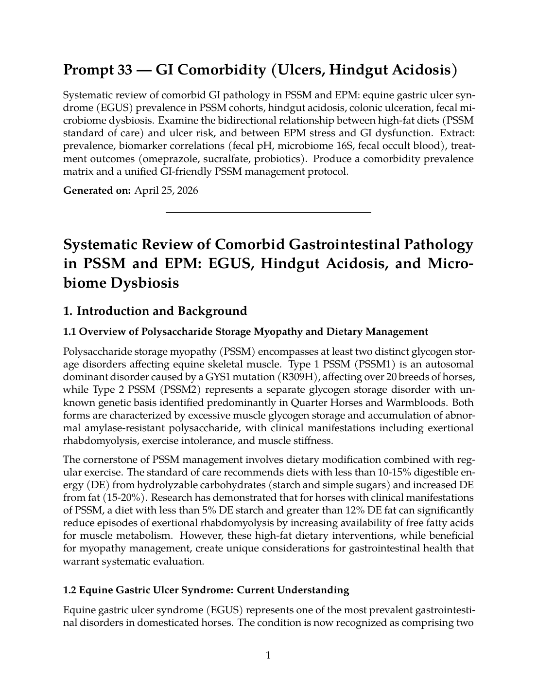 This systematic review argues that gastrointestinal comorbidity in PSSM and EPM populations is a routinely under-managed complication of disease-focused feeding protocols, and that high-fat low-NSC PSSM rations and antiprotozoal-plus-corticosteroid EPM protocols each raise gastric ulcer and hindgut acidosis risk in ways the underlying disease guidance does not adequately mitigate, not only because EGUS prevalence in performance horses already exceeds 60 percent before any disease-specific risk modifier is added, but also because hindgut acidosis and microbiome dysbiosis raise systemic inflammation that confounds both PSSM clinical course and EPM recovery; by reviewing the equine GI pathology, microbiome dysbiosis, and feeding-protocol literature in PSSM and EPM cohorts, this review integrates GI-protective management into the disease-specific protocols and identifies the bidirectional risks the field currently treats in isolation.