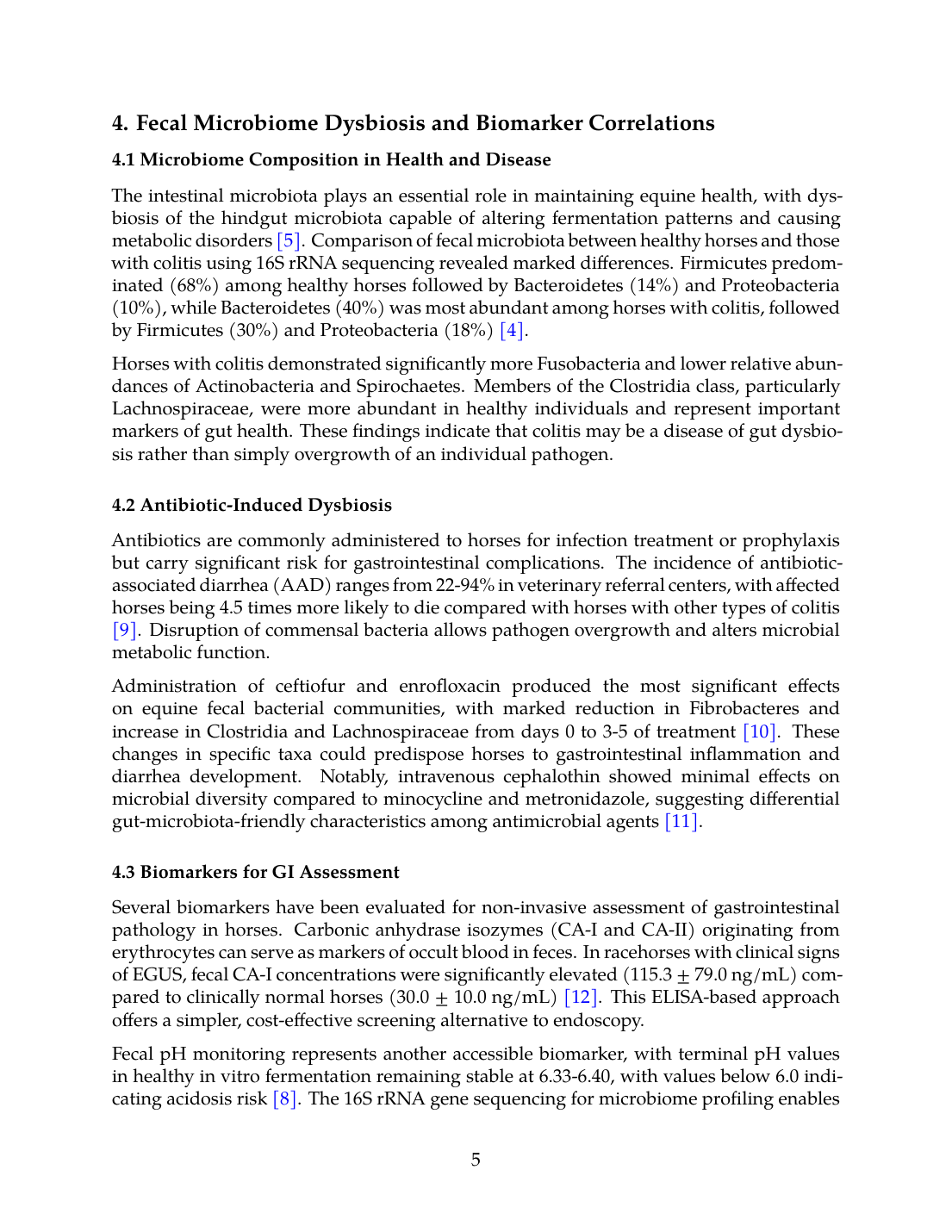 Administration of ceftiofur and enrofloxacin produced the most significant effects on equine fecal bacterial communities, with marked reduction in Fibrobacteres and increase in Clostridia and Lachnospiraceae from days 0 to 3-5 of treatment [10]. These changes in specific taxa could predispose horses to gastrointestinal inflammation and diarrhea development. Notably, intravenous cephalothin showed minimal effects on microbial diversity compared to minocycline and metronidazole, suggesting differential gut-microbiota-friendly characteristics among antimicrobial agents [11].