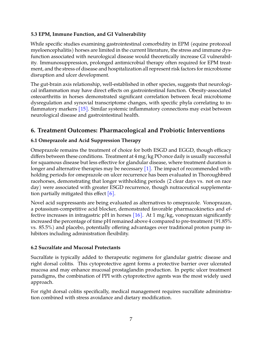 While specific studies examining gastrointestinal comorbidity in EPM (equine protozoal myeloencephalitis) horses are limited in the current literature, the stress and immune dysfunction associated with neurological disease would theoretically increase GI vulnerability. Immunosuppression, prolonged antimicrobial therapy often required for EPM treatment, and the stress of disease and hospitalization all represent risk factors for microbiome disruption and ulcer development.