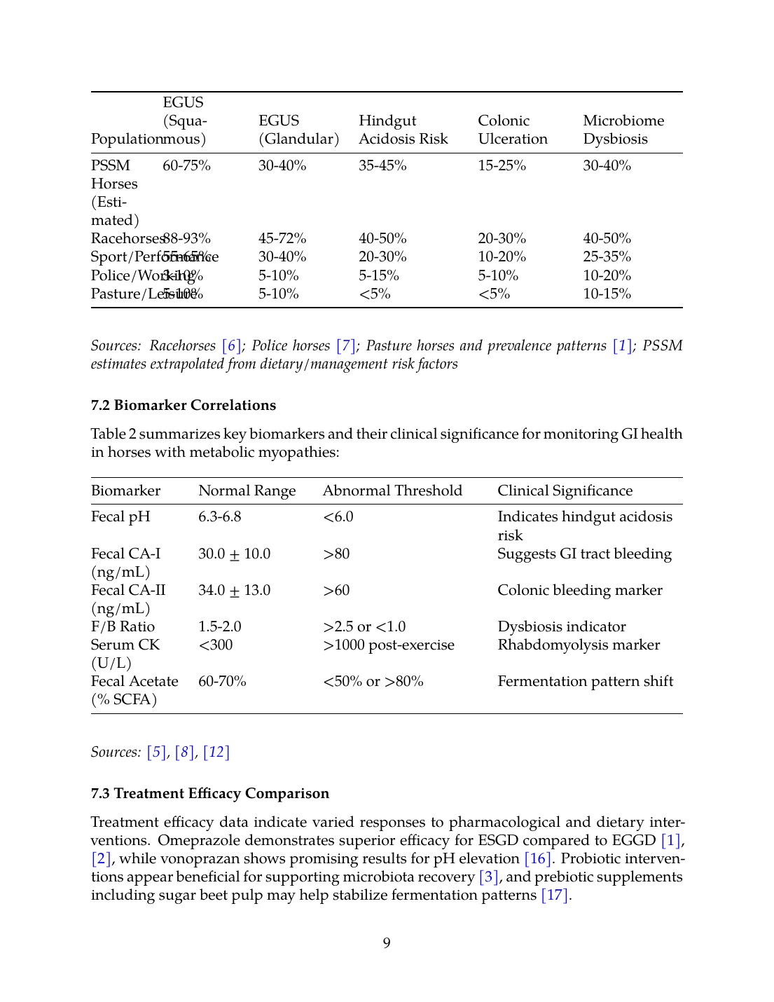 Table 2 summarizes key biomarkers and their clinical significance for monitoring GI health in horses with metabolic myopathies:
