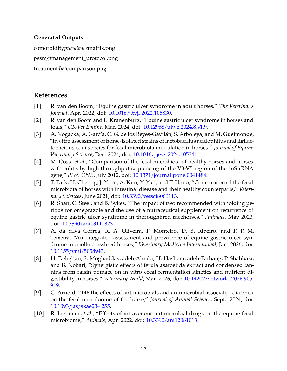 - T. Ford, Z. McAdams, K. Townsend, L. M. Martin, P. Johnson, and A. C. Ericsson, “Effect of Sugar Beet Pulp on the Composition and Predicted Function of Equine Fecal Microbiota,” Biology, Sep. 2023. doi: 10.3390/biology12091254. View source
