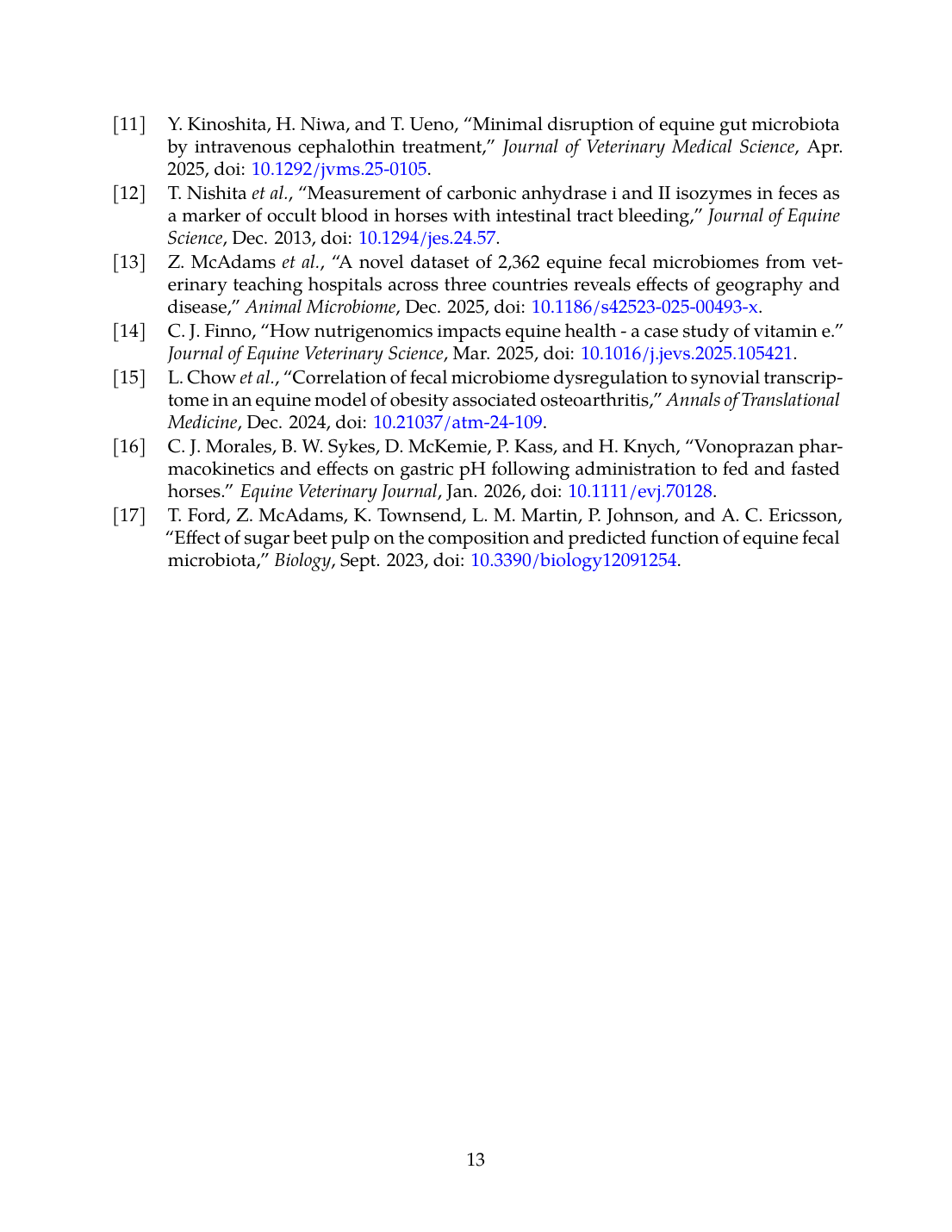 - Z. McAdams, E. J. Campbell, R. A. Dorfmeyer, G. Turner, S. Shaffer, T. Ford, J. Lawson, J. Terry, M. Raju, L. M. Coghill, L. Cresci, K. Lascola, T. Pridgen, A. Blikslager, E. Barrell, H. Banse, L. Paul, A. Gillen, S. Nott, M. Vandecandelaere, G. van Galen, K. Townsend, L. M. Martin, P. J. Johnson, and A. Ericsson, “A novel dataset of 2,362 equine fecal microbiomes from veterinary teaching hospitals across three countries reveals effects of geography and disease,” Animal Microbiome, Dec. 2025. doi: 10.1186/s42523-025-00493-x. View source